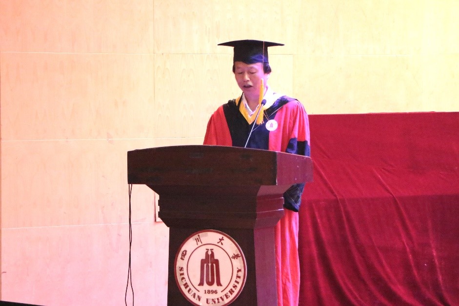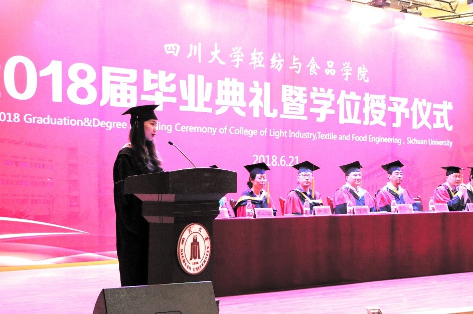Graduate representative, clothing and costume design professional student,  Yanqing Ma reviewed the experience of college of Light Industry, Textile & Food Engineering in Sichuan University in the past four years, thanked the school and the college culture for their profound influence, and called all the graduates to bravely pursue the infinite possibilities.