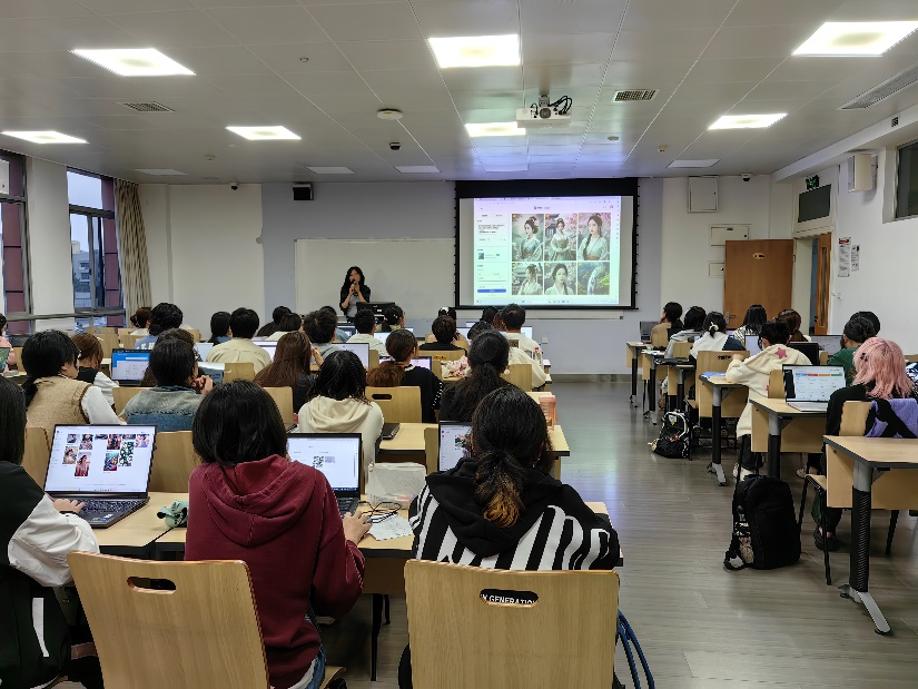 接着,王圣洁老师还为同学们介绍了包括“SCIE(ISI)”、“EI”等英文数据库资源和相关检索技术,并向学生们展示了我校图书馆丰富的学习资源。最后,王老师分享了目前热门的AI生成技术,向学生们介绍了WHEE文生图工具和Liblib网站,为学生们在服装设计专业学习方面提供了新的思路。