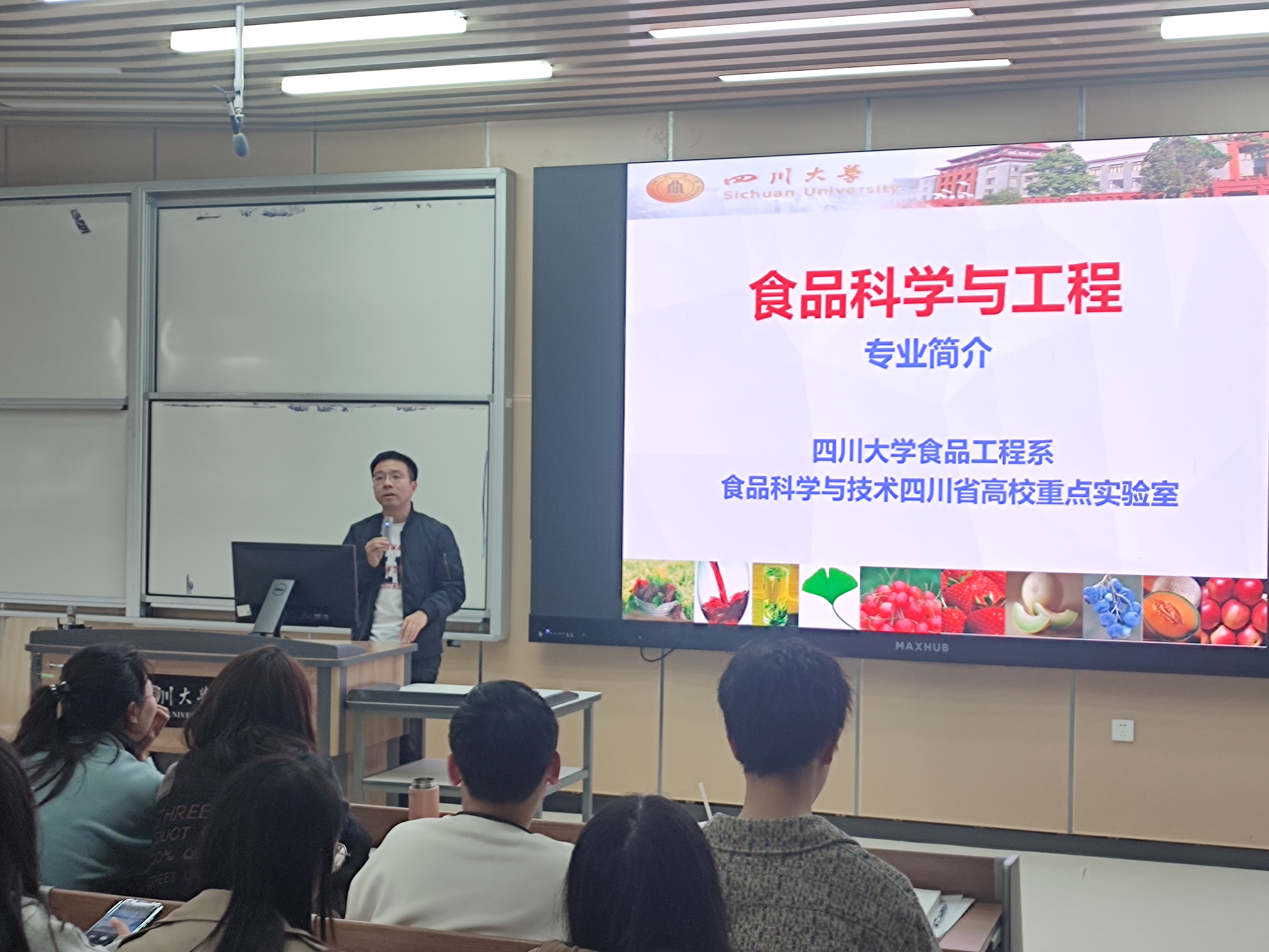 随后,食品工程系副系主任曾维才副教授从研究领域、就业方向、专业优势三个方面为同学们详细介绍了食品科学与工程专业,他联系科学发展和生活常识强调了该专业的必要性与时代性,认真分析了社会各企业和部分政府机关对食品高学历人才的未来需求,为同学们的未来择业提供了更深入具体的专业建议。