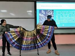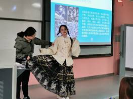按照教育部、学校课程思政建设工作要求,学院积极探索在专业课程中深度融入课程思政内容,将专业课程教育与思想政治教育深入融合,在传授科学文化知识的同时进行大学生思想政治教育。学院课程思政课程组与专业课主讲教师密切配合,深入挖掘思政元素,让思政内容在专业课程中入大纲、入课堂、入过程作业,同时也让专业课课堂内容更加丰富、课堂形式更加多元、课堂氛围更加活跃。在本学期所开设的《少数民族服饰》课程中,在讲授好中国传统知识的基础上,更从扎染、民族服饰——汉服等方面进行了详细的介绍,以培养学生的民族认同感与爱国主义情操。
