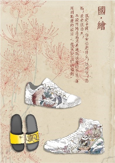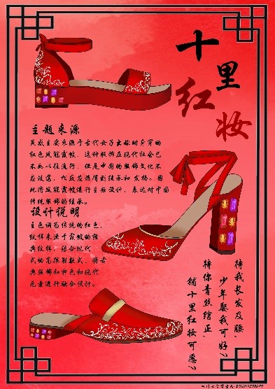 在《鞋类设计与开发》部分的课后作业中,姚云鹤老师也增加了“在设计中融入中华传统文化元素”的内容,引导同学们在课程学习的基础上进行深入思考,在设计实践中融入中华传统文化元素。同学们纷纷在设计图稿中融入中华传统文化的元素,设计出了各具特色的中国风鞋子。