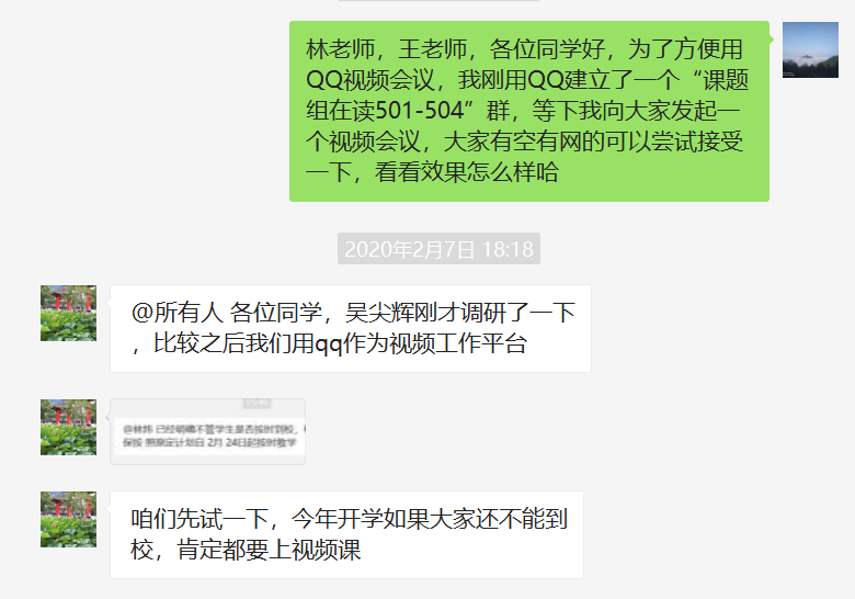 疫情初期,林炜老师心系课题组的每一位成员,详细盘问每一位同学的身心健康,告诫大家特殊时期不要到处走动,并叮嘱大家要坚持锻炼、保持良好的作息习惯和愉悦的心情。与此同时,林炜老师认真贯彻落实疫情防控背景下“停课不停教、停课不停学”的指示精神和工作要求,全力保障课题组每一位同学有序开展工作,利用微信和邮箱等线上工具与学生进行深入交流探讨,并在2月7号利用QQ视频会议组织课题组学生线上研讨课题进展,指导并规划好各个年级同学疫情期间学习计划。