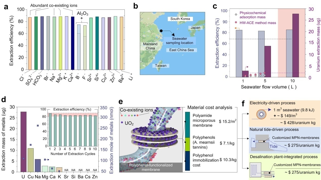 石碧院士课题组通过皮革、化工、材料等多学科的交叉融合,利用铀能高选择性的与多酚形成稳定配合物的原理,将植物多酚(单宁)固定在微孔滤膜上,构建出了通量大、选择性高、可多次循环使用的海水提铀新型膜材料,解决了目前海水提铀中的高选择性及经济性等关键问题。