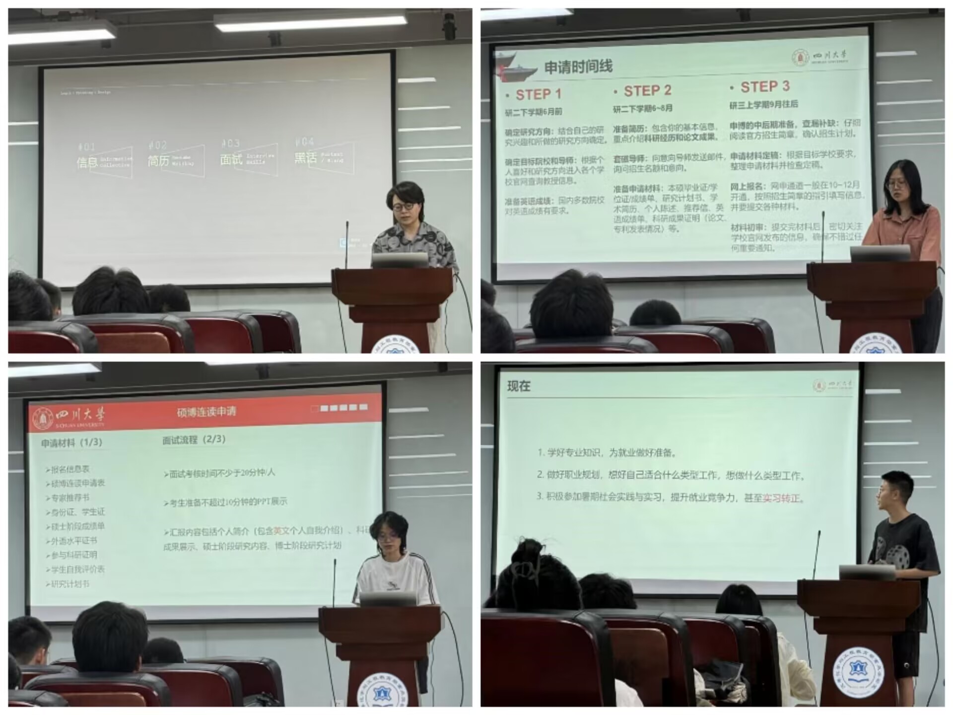 随后,入职四川航空股份有限公司的2021级食品工程专业硕士研究生蒋雨含同学与入职宝洁中国的2021级轻工技术与工程专业硕士研究生周子毅同学从就业信息、简历制作、面试技巧、“行业黑话”四个方面为同学们进行了全方位的信息分享。他们认为找工作既要大胆更要细心,应广泛投递简历,抓住每个面试机会,在面试中不断汲取经验,提升个人能力。周子毅同学提到:“相较于线上面试,线下面试更能展现个人能力,应把握机会,不错过每一个线下面试机会。”