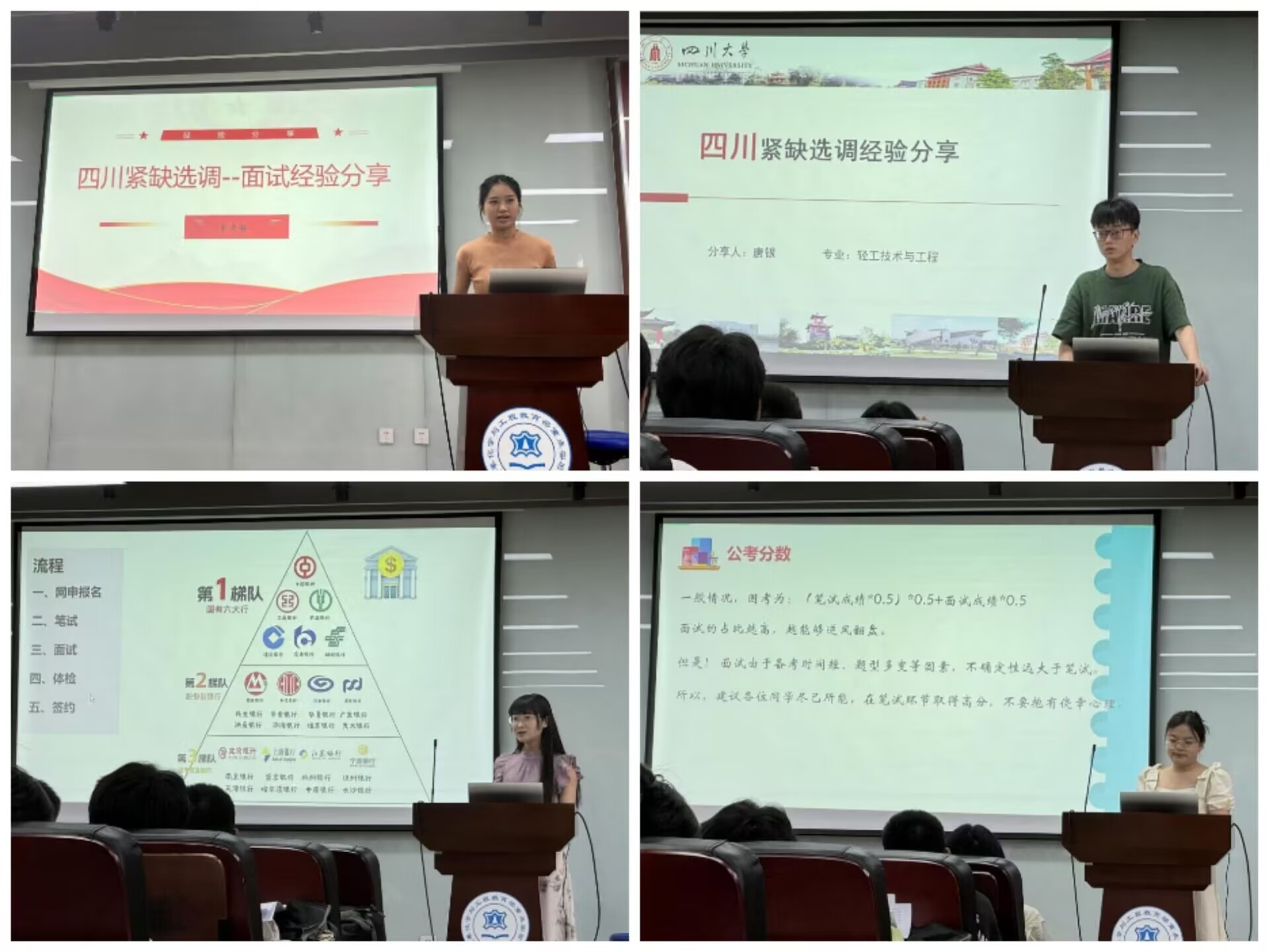 紧接着,成功考取宜宾紧缺选调的2021级食品工程专业硕士研究生朱美淋同学、成都紧缺选调的2021级轻工技术与工程专业硕士研究生唐银同学与成都选调岗位的2021级食品工程专业硕士研究生张彤同学从考公方面展开分享,对同学们普遍关心的选调、国考、省考等公务员考情进行了分析,详细介绍了应该如何高效地准备行测、申论、专业课等在内的考试内容,并提出在面试环节应大方得体,不可过度紧张。同时,他们也建议大家在备考时可以在能力范围内多参加考试,从实践中摸索经验,增大上岸概率,做到灵活选择。