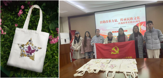 随后,胡熏允同志以“献礼改革开放46周年”为主题,带领大家学习并实践传统手工艺术“草木染”,巧妙地将红色教育与传统文化相融合。胡熏允同志从草木染的历史渊源、文化价值、艺术价值、生态价值、草木染在新时代的发展、草木染的种类几个方面带领大家全面认识草木染,并详细讲解了草木染中敲拓染这一技法。紧接着,全体党员进入草木染环节。党员们从亲手采集的校园内的各类植物叶片与花朵中挑选素材,设计图案布局,运用敲拓染传统技艺,让植物的汁液渗透到织物上,将自然之美定格在帆布包上。这一过程不仅锻炼了党员们的创造力和动手能力,更让大家在亲近自然、感受传统文化魅力的同时,体会到耐心、专注与坚持的重要性,如同每一位党员都需秉持这样的品质,扎实走好每一步。活动过程中,党员们相互交流、协作互助,在一片欢声笑语中完成了一件件饱含心意与创意的敲拓染作品。这一过程,不仅是艺术实践,更彰显了党员们对时代发展与文化传承的深刻感悟与担当。