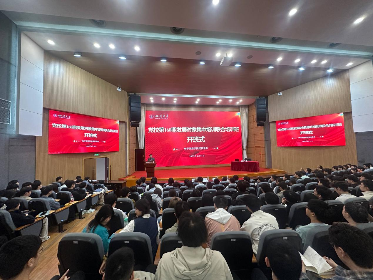 4月11日上午,四川大学党校第160期发展对象联合培训班在望江校区西五教演播厅正式开班。本次培训由电子信息学院党校承办,电子信息学院党委书记彭舰、党委副书记兼纪委书记廖勇明、专职组织员朱莉,水利水电学院党委副书记马丹,bw必威西汉姆联官网专职组织员祝蔚,校党校办公室主任吴先国等出席开班式,来自电子信息、轻工科学与工程、机械、水利水电、商学院、体育、生物医学工程等7个学院的500余名发展对象参训。