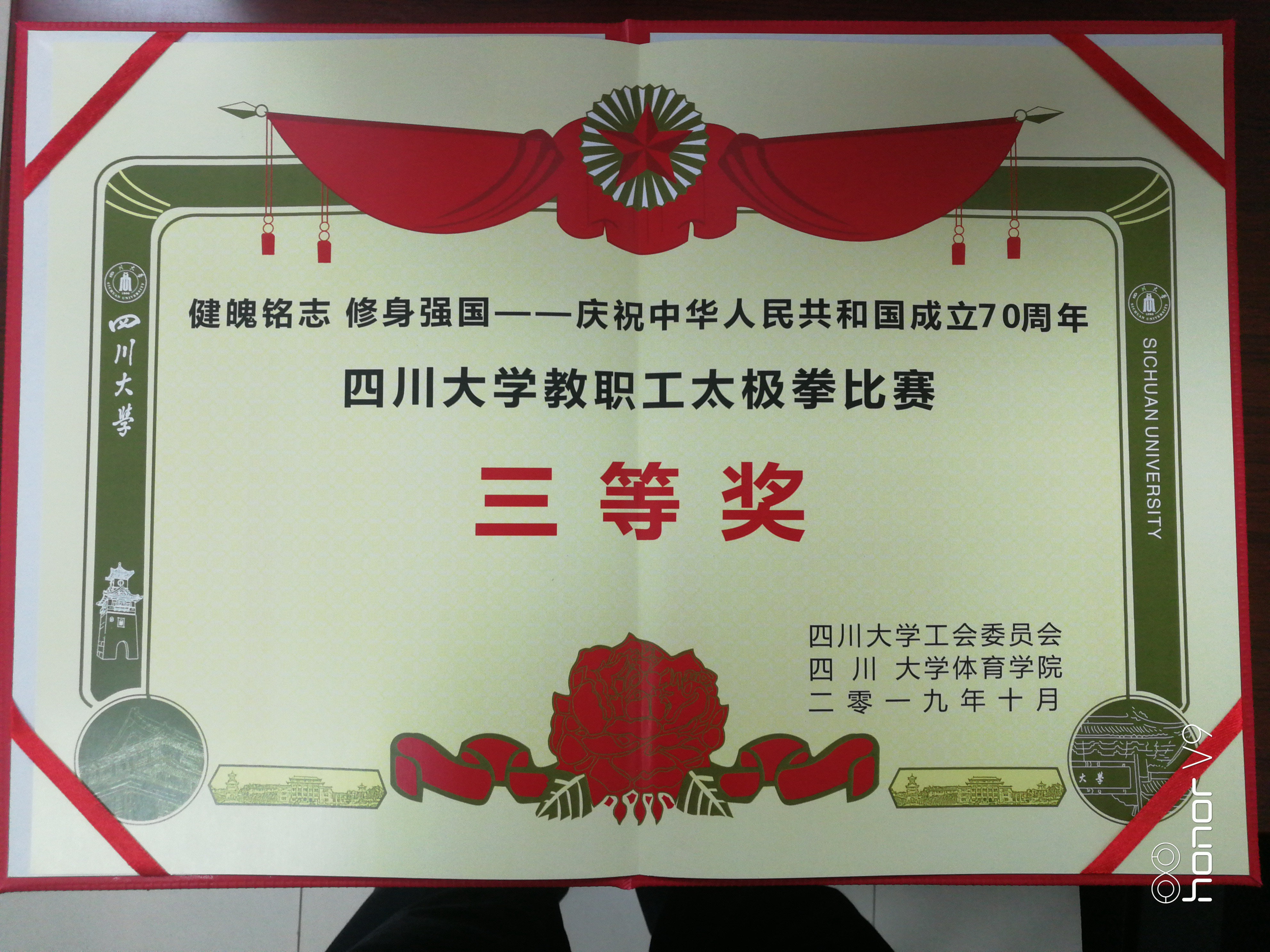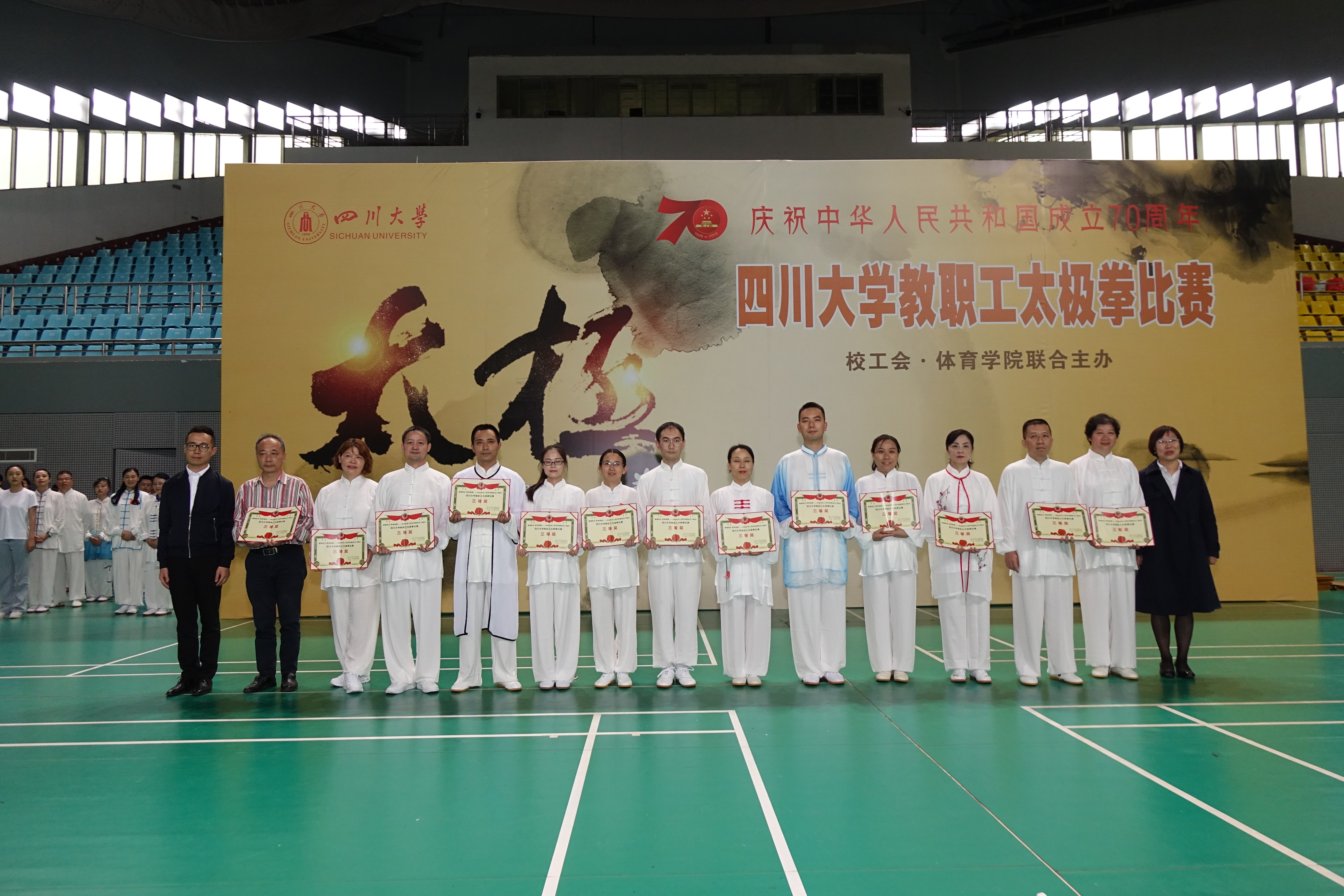 为庆祝新中国70周年华诞,弘扬中华传统文化,传承太极文化精髓,促进校园全民健身运动积极开展,倡导广大教职工走出办公室、走上运动场,强身健魄,身体力行,丰富校园文化生活,展示我校教职工健康向上的良好精神风貌,四川大学于2019年10月18日举办“健魄铭志·修身强国”——四川大学庆祝新中国成立 70 周年教职工太极拳比赛。