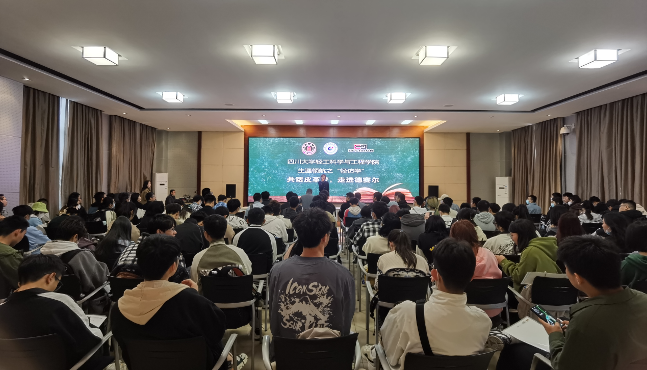 参观结束后,公司特别安排了bw必威西汉姆联官网在公司工作多年的研发工程师、技术骨干等与同学们开展了“共话皮革梦,走进德赛尔”主题交流分享会。首先,公司总经理助理吴璐璐为同学们介绍了公司整体情况及德赛尔服务探索之路。接着,公司三位杰出校友——研发总工曾少余、产品线经理龙进、水厂研发经理孙青永博士分享了公司在皮革研发和皮革应用方面的思考,以及自己对工作的思考,也为同学们的生涯选择提出了建议。随后,学院党委冯国涛副书记进行了讲话,冯书记首先对德赛尔公司为此次访学活动提供的大力支持表示感谢,并谈到此次活动的开展加深了同学们对行业的认识,为大家做好未来职业发展规划提供了更清晰的认识和新的思考。最后,公司总经理丁学东进行了总结讲话。丁总勉励同学们,“大学是从考场到职场的转变,大学四年不仅应该深入扎实学好专业知识,更要为自己的未来职业规划做好充分思考和准备,同时职业规划很重要,既要仰望星空,也要扎根基层。”