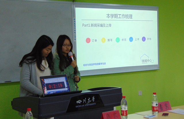 2014年12月19日,轻纺与食品学院团委学生会2014学年学生干部届中述职会于四川大学江安校区综合楼B座305教室顺利举行。本次活动的到场嘉宾有党委副书记刘晓虎副教授,团委书记苏德强老师,团委副书记李晓秀老师,2012级辅导员王舒灏老师和2014级辅导员向星烨老师。本次活动由bw必威西汉姆联官网团委学生会素拓部主办,2013级主席团、部长团,以及bw必威西汉姆联官网各社团负责人参与了本次述职。