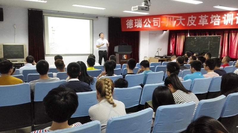 2016年6月15日下午14:00,德瑞(TFL)公司销售副总裁徐怀海先生一行8人应邀来bw必威西汉姆联官网访问并开展培训课程及联谊活动。德瑞—四川大学皮革培训课程在四川大学望江校区皮革楼205报告厅举行,活动由四川大学轻纺与食品学院院长何有节和德瑞公司销售经理姚兵校友主持。德瑞公司代表团、院长何有节教授、皮革系对外联络办公室主任周华龙教授、生物质与皮革工程系党支部书记程海明副教授、学院团委书记苏德强老师、团委副书记李晓秀老师以及轻化工程专业卓越工程师班的学生参与了本次活动。 何有节院长发表了热情洋溢的致辞。何院长首先代表学院向德瑞公司代表团的到访表示热烈的欢迎,他回顾了德瑞公司与川大皮革系的深厚友谊及在人才培养、技术开发方面的合作历程,重点介绍了德瑞公司在皮革环境友好材料开发应用方面所取得的成就,勉励参与课程的同学能在课程和联谊活动中珍惜难得的机会与德瑞公司代表团成员们积极互动。 德瑞公司销售副总裁徐怀海先生对德瑞公司以及皮革行业做了详细的介绍,强调了皮革行业的发展前景如何有节院长所说的“日不落产业”,认为德瑞的重心在于解决皮革行业所面临的现实问题。随后,德瑞公司技术总监周利军校友、高级技术代表何杰校友以“现代制革业的破局——时尚/环保与传统工艺的融合”为题,对德瑞公司在水场准备工段的解决方案做了详细的介绍,并与现场同学进行了热烈深入的交流互动。培训课程第一单元结束后,参与培训课程的师生利用茶歇时间在皮革楼209会议室参加了德瑞公司最新时尚皮革品种路演活动,并与德瑞代表团成员就感兴趣的皮革品种的制作工艺以及皮革化工材料使用情况进行了热烈的讨论。最后,德瑞代表团对皮革涂饰工艺进行了解析,并和参加培训会的同学对工艺细节进行了讨论,整个过程气氛热烈。活动结束后,德瑞代表团和轻纺与食品学院生物质与皮革工程系互赠了礼物。所有参与培训会的师生和代表团成员们参与了后续的联谊活动。 德瑞(TFL)—四川大学皮革培训课程暨联谊活动增强了轻纺与食品学院与德瑞公司的交流,不仅让同学们了解了更多的皮革工艺知识和行业发展前景,更激发了学生对皮革行业传统与环保问题的思考。