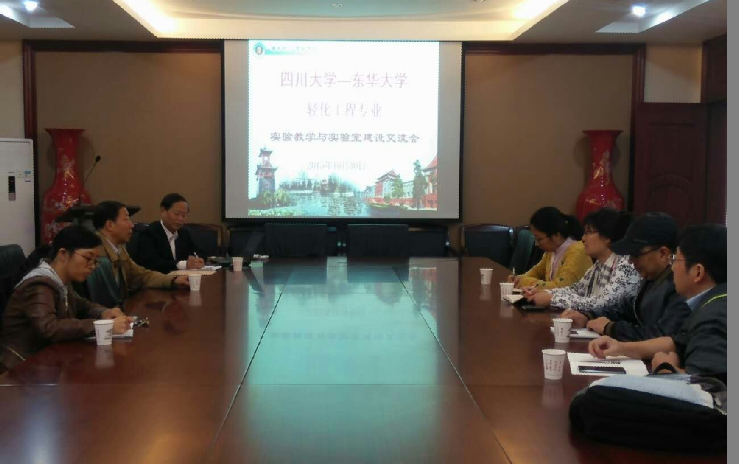 2015年10月30日,东华大学化学化工与生物工程学院陈英教授、轻化工程系实验室闵洁主任、朱智甲、杨卓副教授一行访问bw必威西汉姆联官网,生物质与皮革工程系“轻化工程及轻工生物技术实验室”陈慧主任、陈武勇教授、何有节等参加了会议。陈慧主任详细介绍了川大轻化工程专业实践教学计划和内容、实施方式等。陈英教授介绍了东华大学轻化工程专业的实践教学和卓越工程师计划的实施情况。双方就两校“轻化工程”专业实践教学、实验室建设、卓越工程师计划、实习基地建设等进行交流。