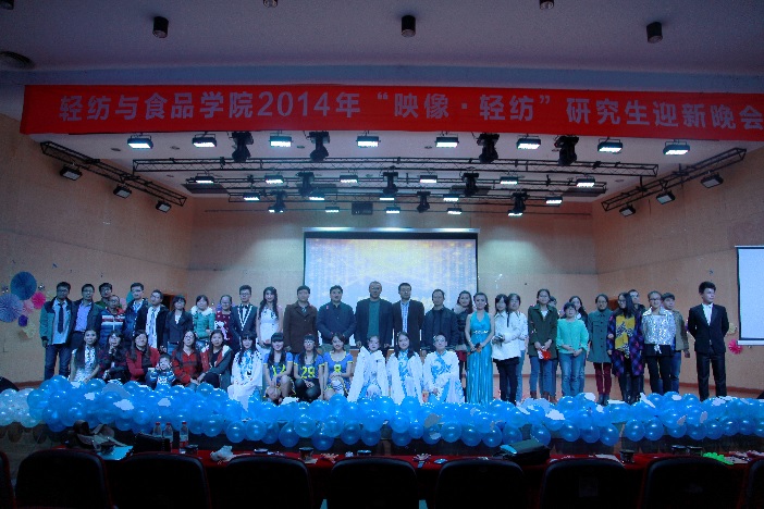 2014年11月30日19:00,轻纺与食品学院2014级“映像·轻纺”研究生迎新晚会在四川大学文华活动中心二楼音乐厅隆重举行。本次晚会有幸邀请到轻纺与食品学院党委赵毅书记,院长何有节教授,党委副书记刘晓虎副教授,副院长肖凯老师,院党政办主任李慧老师,学生科科长冯国涛老师,院团委书记苏德强老师,以及学生工作组全体辅导员、部分专业老师。轻纺与食品学院2014级新生到场观看了晚会,场内座无虚席。
