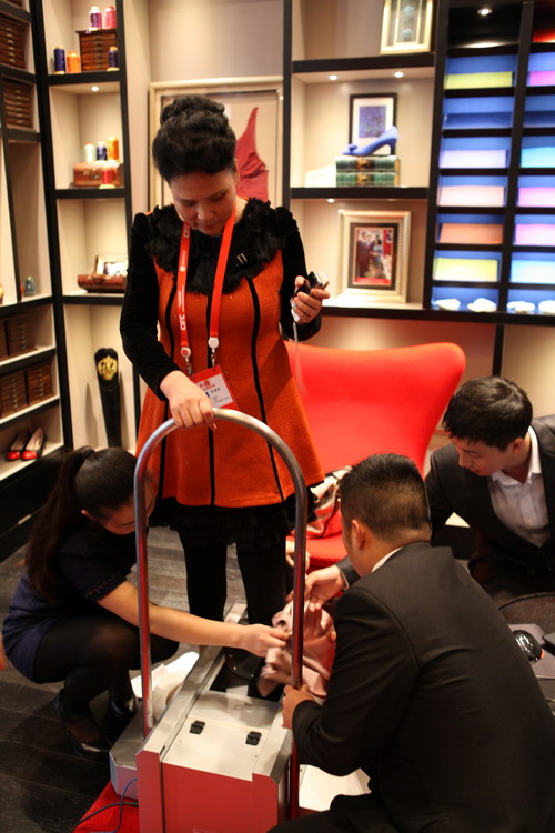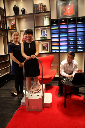2013年9月26日,革制品研究生伍舒闻和冉美玲同学受成都艾民尔有限公司邀请,携3D足部扫描仪到成都仁恒置地SHEME品牌门店为各国来宾进行专业的足部激光三维扫描测试。通过三维扫描,可以清晰准确的显示足部20预想长度、宽度及围度数据,不仅可以显示人的足型特点,还可以知道购买更加舒适合脚的鞋靴。革制品同学现场的认真和专业吸引了大批华商的兴趣,并获得一致好评。
