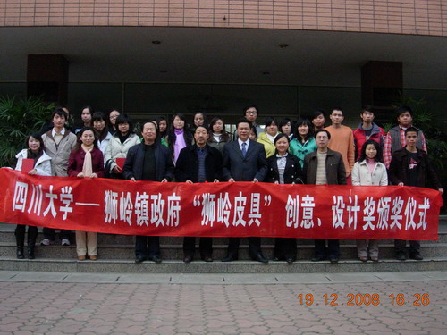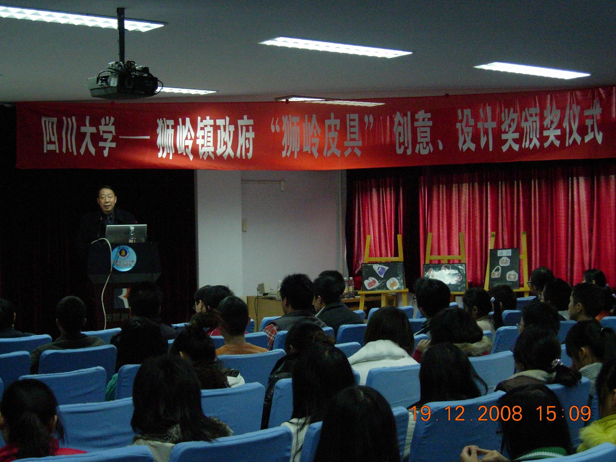 四川大学——狮岭镇政府“狮岭皮具”创意、设计奖学金颁奖典礼隆重举行 2008年12月19日下午14:30,四川大学——狮岭镇政府“狮岭皮具”创意、设计奖学金颁奖典礼在皮革楼报告厅隆重举行。参加本次颁奖典礼的嘉宾有狮岭镇政府党委委员童志辉先生;狮岭镇皮革皮具研发中心主任周南女士;轻纺与食品学院院长陈武勇教授、副院长何有节教授;革制品教研室徐波老师、曾琦老师、姚云鹤老师及2005级本科生、2007及2008专科生同学。颁奖典礼由冯国涛老师主持。 陈武勇院长首先代表学院致辞,对狮岭镇政府长期以来对四川大学的支持与关注,在我校设立奖学金表示衷心的感谢,对我校校友周南女士能在百忙之中回到母校表示热烈的欢迎,并期望与同学们有深入细致的交流。随后,童志辉先生介绍了代表狮岭镇政府介绍了狮岭皮具及其他方面发展状况,并热忱邀请同学们到狮岭创业就业,为狮岭皮具发展 贡献力量。童先生对本次获得奖学金的同学表示祝贺,并勉励大家以此为新的起点,争取明年取得更加优异的成绩。接下来,何有节教授宣布了获奖名单,并与童志辉先生、周南女士一起为取得比赛优异成绩的同学颁发了证书和奖学金。最后,一等奖获得者冷梦春同学代表本次获奖同学作了发言,她首先是对设奖单位表示感谢,并表示在以后的学习中,定将倍加努力,不辜负老师、企业的一片期望。 颁奖典礼结束后,童志辉先生、周南女士还与同学进行了深入的交流与互动。