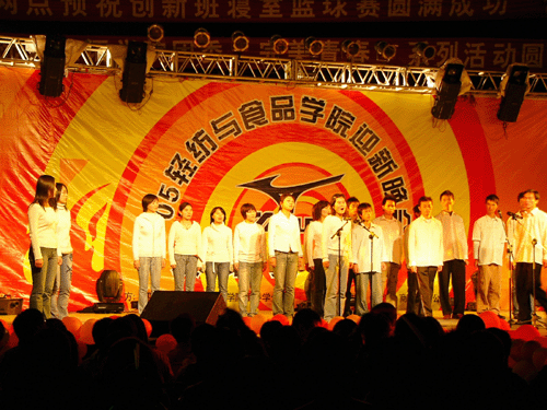 晚会以2004级纺织班小合唱《让世界充满爱》暖场拉开序幕后,学院党委刘学文书记作了热情洋溢的讲话;陈武勇院长为11月份过生日的新生送上了温馨的祝福并现场将2003级食品专业学生精心制作的生日蛋糕切分;随后川大老教师舞蹈团献上的舞蹈《七月火把节》、《美阿里》一下子将晚会的气氛推向高潮;接下来从近三十个报送节目中脱颖而出的十二个节目逐一闪亮登场,它们中既有耳熟能详的流行音乐,又有底蕴深厚的戏剧连唱,既有充满动感的舞蹈,又有静如流水的古筝弹奏,既有严谨的传统相声,又有搞怪的网络短剧,最值得一提的是2004级服装专业近似专业的作品展示秀,引来了新生的阵阵喝彩;最后,晚会在2005级新生的一曲《明天会更好》中圆满结束。
