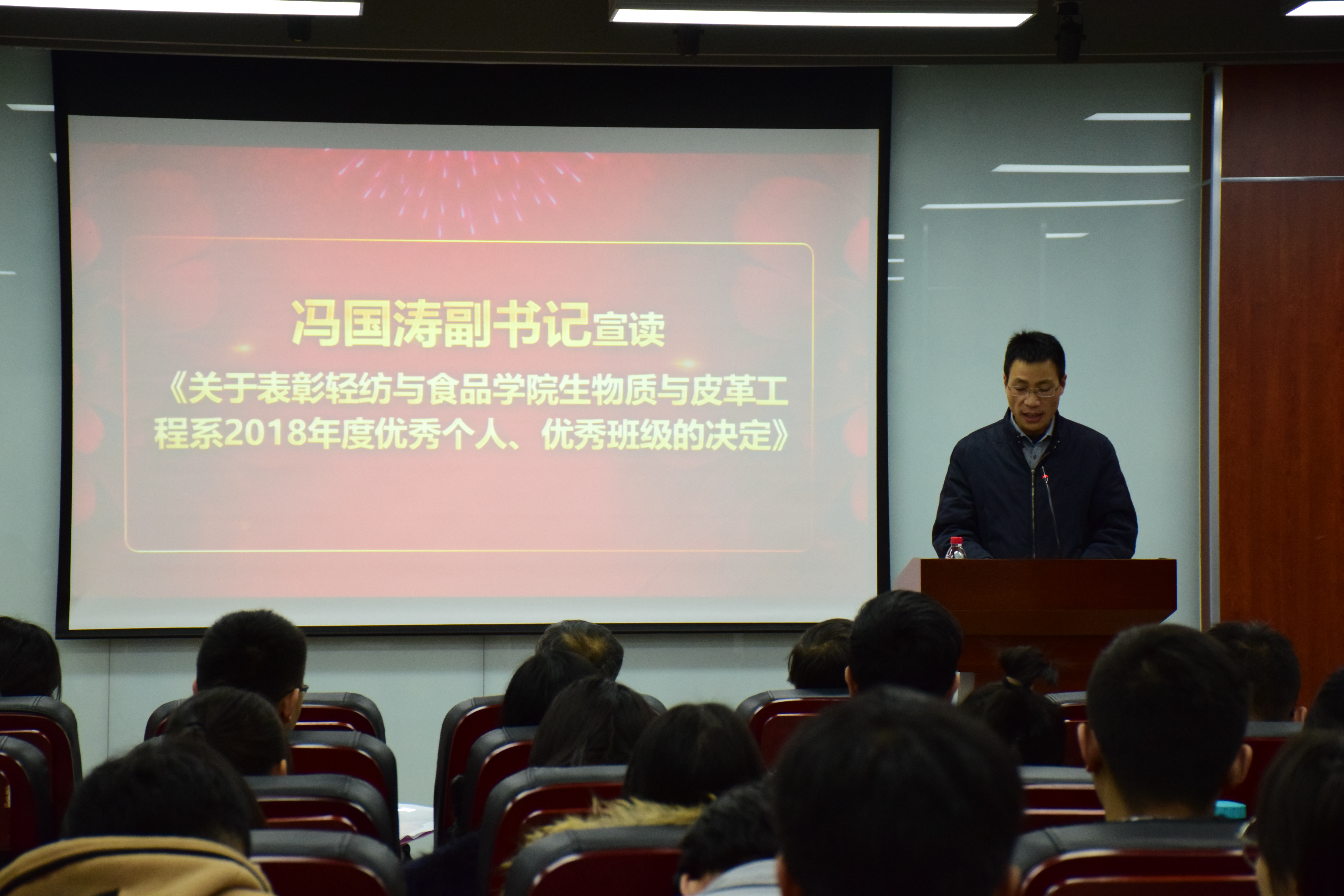 随后,轻纺与食品学院党委副书记冯国涛老师宣读了《关于表彰轻纺与食品学院生物质与皮革工程系2018年度优秀个人、优秀班级的决定》。在隆重的颁奖音乐中,学院领导及与会嘉宾为获奖同学一一颁奖并合影留念。最后,获奖学生代表,2016级轻化工程专业李明辉同学发言,表达了对设奖单位的感谢,对学院生物质与皮革工程系长期的培养与教育表示谢意,并表示一定以此为新的起点,继续努力,取得更优异的成绩回报行业、社会以及学校。