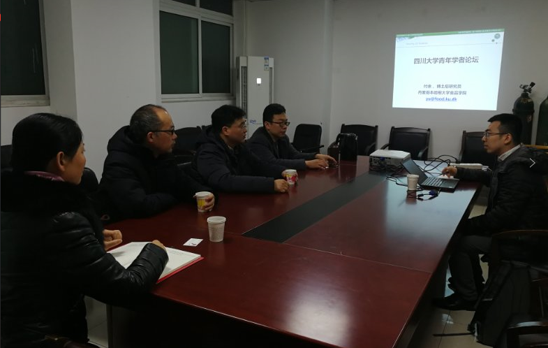 20181219日,轻纺与食品学院刘晓虎书记、何强副院长、食品系主任吕远平教授、副主任迟原龙副教授在纺工楼会议室与丹麦哥本哈根大学付余博士进行交流座谈。座谈会上刘晓虎书记首先对付余博士的到访表示了欢迎,然后对四川大学科技强校的办学理念、轻纺学院学科发展、教师队伍建设、人才培养等方面的具体措施和成效做了介绍,并欢迎付余博士到院交流。付余博士对轻纺学院的热情接待表示了感谢,并在学术背景、研究方向和取得成果,以及未来的发展规划等方面进行了自我介绍。接下来,双方在轻松愉快的气氛中对科学研究、个人发展、人文生活等进行了深入交流。