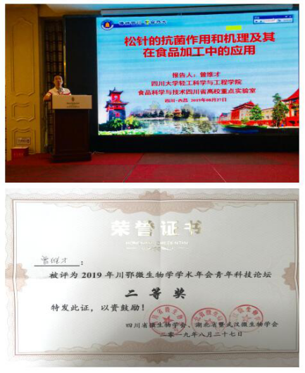 2019826-28日,由四川省微生物学会和湖北省暨武汉微生物学会主办的2019年川鄂微生物学学术年会在四川西昌市隆重开幕,bw必威西汉姆联官网食品工程系曾维才副教授应邀出席大会,并积极参与了微生物资源发掘与利用、微生物与环境保护、微生物与人口健康、微生物与食品安全等方面的科技交流,共同探讨微生物学领域最新科研成果和技术。会议期间,曾维才老师在大会青年科技论坛做了主题为“松针的抗菌作用和机理及其在食品加工中的应用”科技报告,现场反响热烈,获得了大会组委会授予的2019年川鄂微生物学学术年会青年科技论坛二等奖”,受到了与会专家的一致好评,积极地扩大了川大食品学科的影响力。