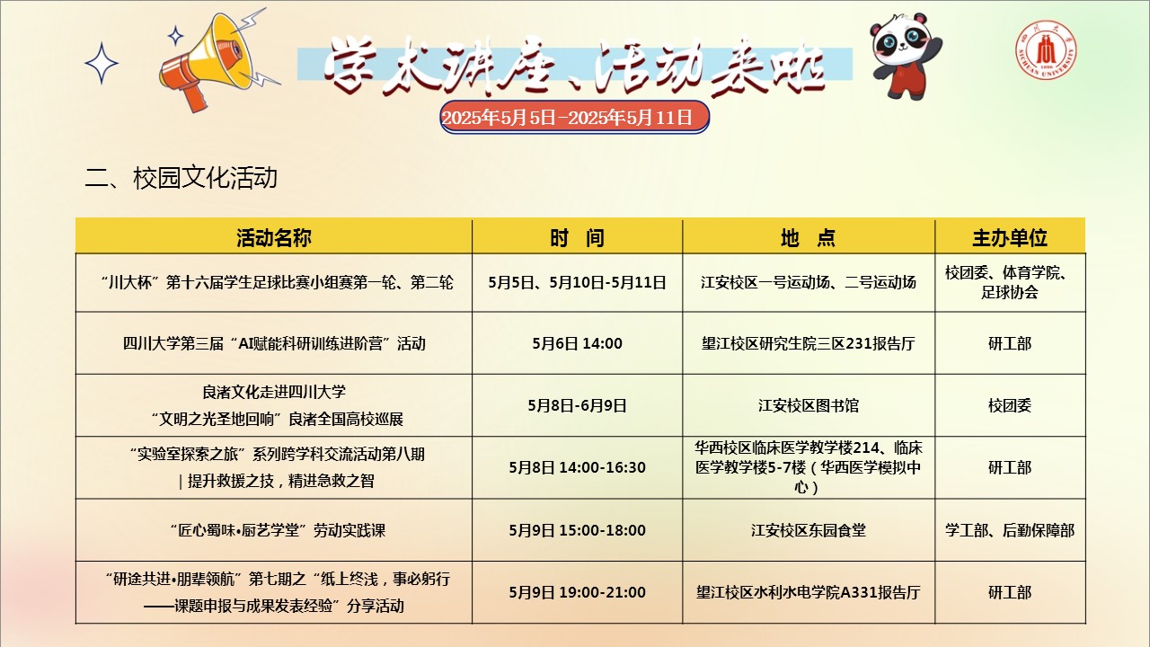 学术讲座论坛及校园文化活动预告(2025年5月5日-2025年5月11日)