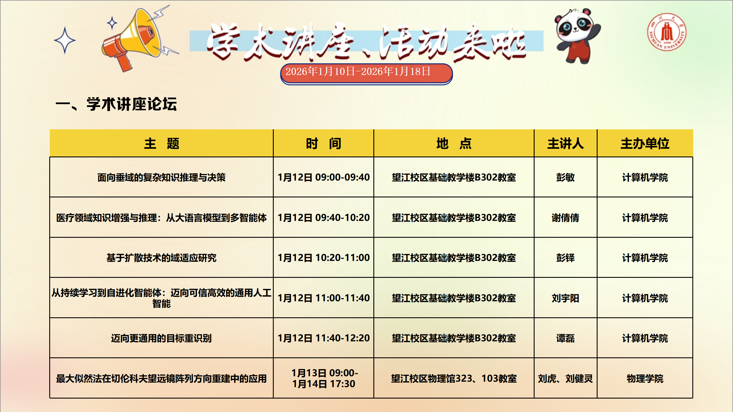 学术讲座和校园文化活动预告(2026年1月10日-2026年1月18日)