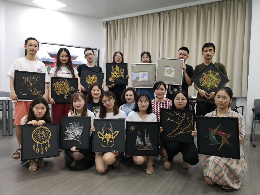 课堂上,周爱华老师结合蜀绣衣锦纹针法,并以《中国非遗蜀绣衣锦纹针法图谱》中的图案为例,详细阐述了如何从“非遗”蜀绣衣锦纹针法中的“格子”出发,通过创新设计形成具有一定韵律的图案从而达到出演“格韵”的课程内容。吴玉英女士讲解了蜀绣衣锦纹针法的历史及特点,并现场演示了蜀绣衣锦纹的刺绣针法,同学们对所学内容表现出了极大的兴趣,纷纷体验了衣锦纹针法的刺绣过程。在一周的时间内,同学们完成了绕线画的个人创作以及蜀绣衣锦纹针法图谱的A3平面创新设计。