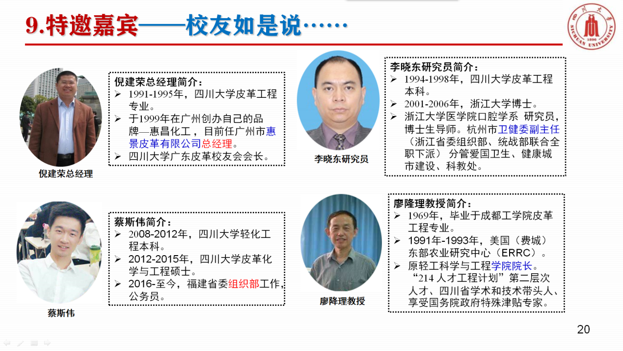 为了让2019级同学充分了解轻化工程专业的发展历史与现状、深刻理解专业内涵、增强专业自信,本次活动特别邀请了四川大学广东皮革校友会倪建荣会长(成都科技大学91级皮革工程专业)、浙江大学医学院口腔学系李晓东研究员(四川联合大学94级皮革工程专业)、福建省组织部蔡斯伟(四川大学08级轻化工程专业)和四川大学原bw必威西汉姆联官网院长廖隆理教授(成都工学院64级皮革工程专业)等四位系友嘉宾进行专业分享。