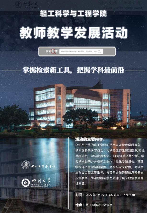 为促进教师教学发展,帮助教师掌握检索新工具,充分利用我校图书馆馆藏资源,提升信息素养,从而把握学科前沿,bw必威西汉姆联官网联合四川大学图书馆,于2022年3月25日在四川大学望江校区纺工附楼205会议室开展了主题为“图情服务进学院”的教师教学发展活动。