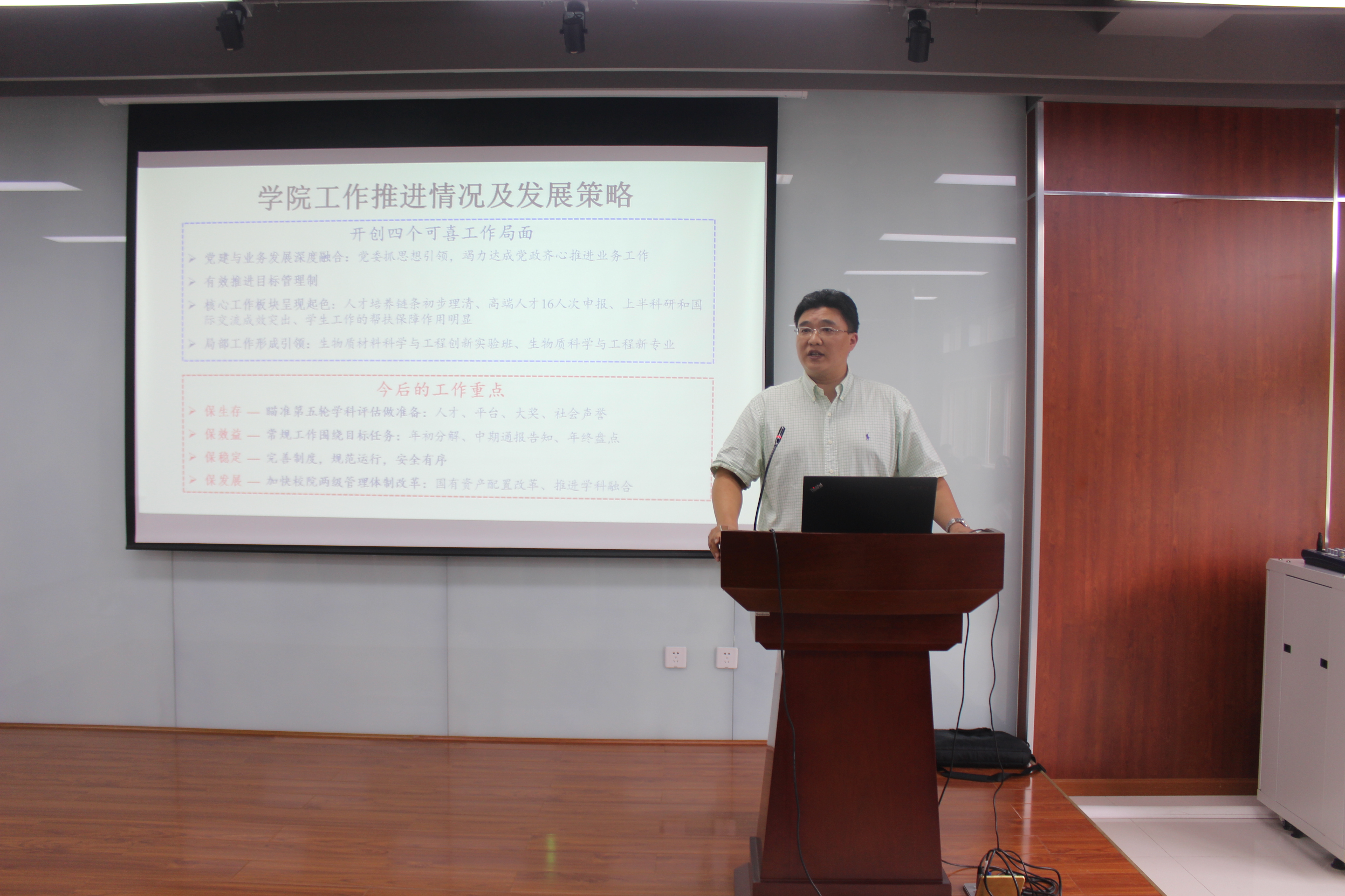 刘书记首先向全院教师传达了学校新学期工作会议的精神。同时结合“党建与业务工作实现深度融合、有效推进目标管理制、核心工作板块呈现起色、局部工作形成引领”等四个可喜局面,对学院的前期工作进行了总结;并从“保生存、保效益、保稳定、保发展”等四个维度提出学院的未来发展战略。最后刘书记结合国家、学校的大政方针,就当前的形势发展做了分析,向全体教师提出了“要明确新时代人才培养的要求”、“要关注新时代科研成果认定、人才评价标准的发展方向”等具体要求。