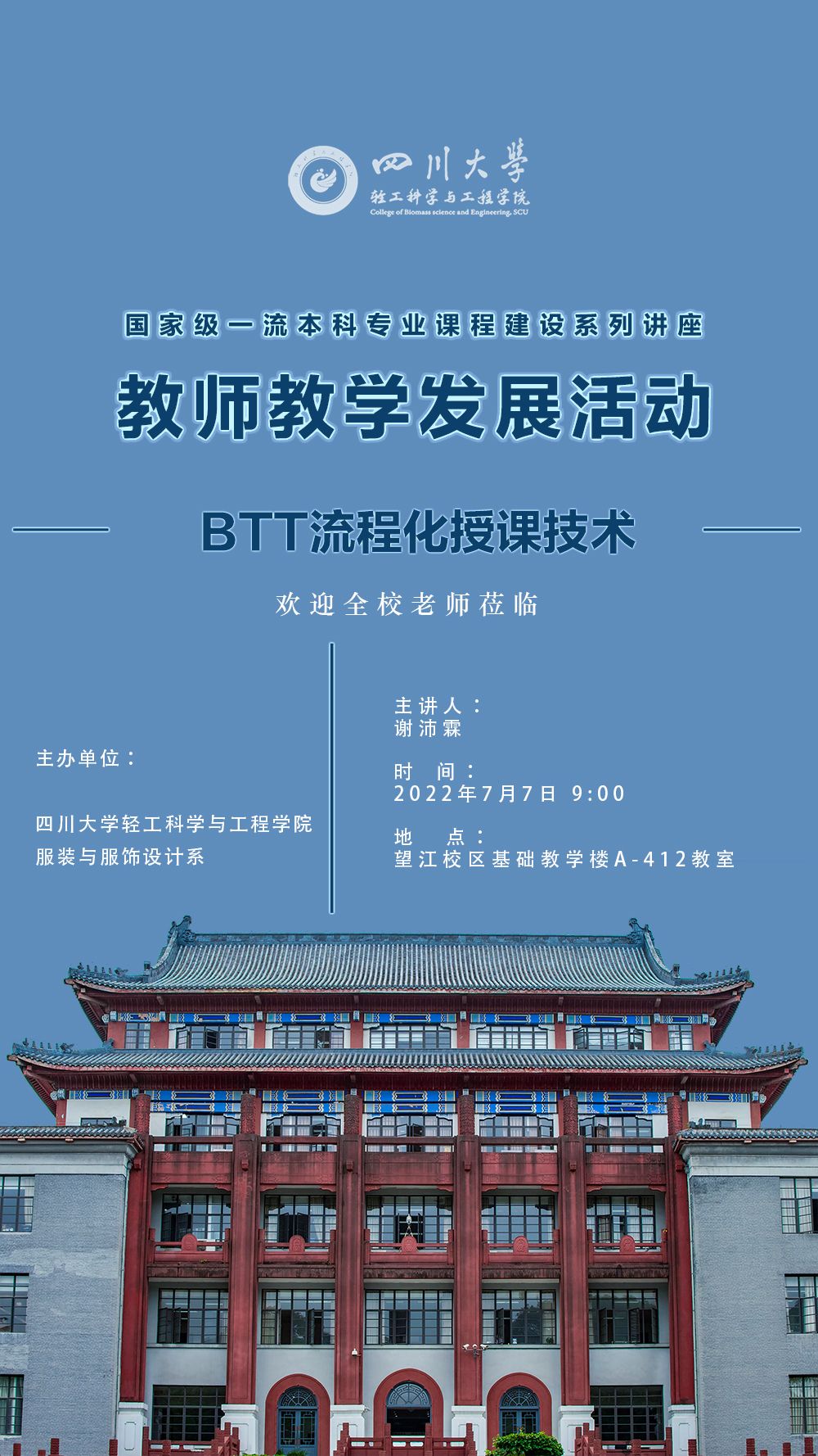 为落实国家级一流专业建设点建设目标任务,进一步提升教师教学水平,打造一流课程,引导教师倾心教学、研究教学方法,服装与服饰设计系于2022年7月7日上午在四川大学望江校区基础教学楼A412教室开展了主题为“BTT流程化授课技巧”的教师教学能力提升活动。教学院长陈意教授、服装与服饰设计系主任杨璐铭教授、院长助理金垚副教授、学院人才培养与科研管理办公室主任祝蔚老师、服装与服饰设计系全体教师参加了此次活动。