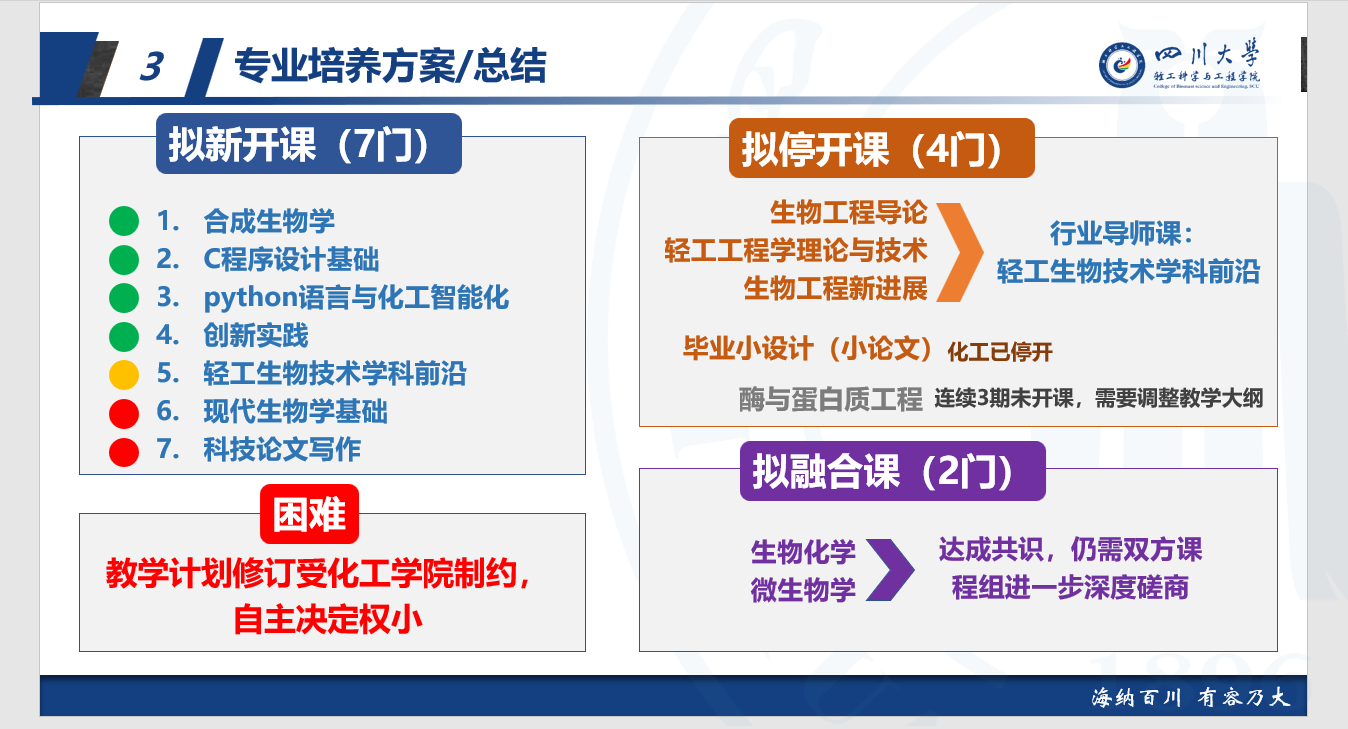 会上,经过各位参与教师的研讨,首先凝练了生物工程的专业内涵是利用生物转化底盘理论与平台技术实现低碳生物制造,指出人才培养的核心目标是培养具有工业生物技术领域扎实学科理论基础和专业技能的,能够运用合成生物学等前沿技术理论解决轻工、大健康等领域工程问题的,具有家国情怀、创新精神、国际视野和实践能力的卓越人才。将专业培养方案从通识教育、实践教育、专业教育三个领域出发规划了更加详细的阐述,田永强教授、秦久福教授分别从新生特点、专业发展等方面提供了中肯的建议,提出可开展创新性强的交叉课程,开展更多有关生物信息数据挖掘的课程,针对基础普适性课程也可做适当停开。与会老师研讨了有关课程特点、新生特征和专业特质后,结合本专业实际情况确定了培养方案的修订,最终决定拟新开课7门,停开课4门,拟融合课2门。