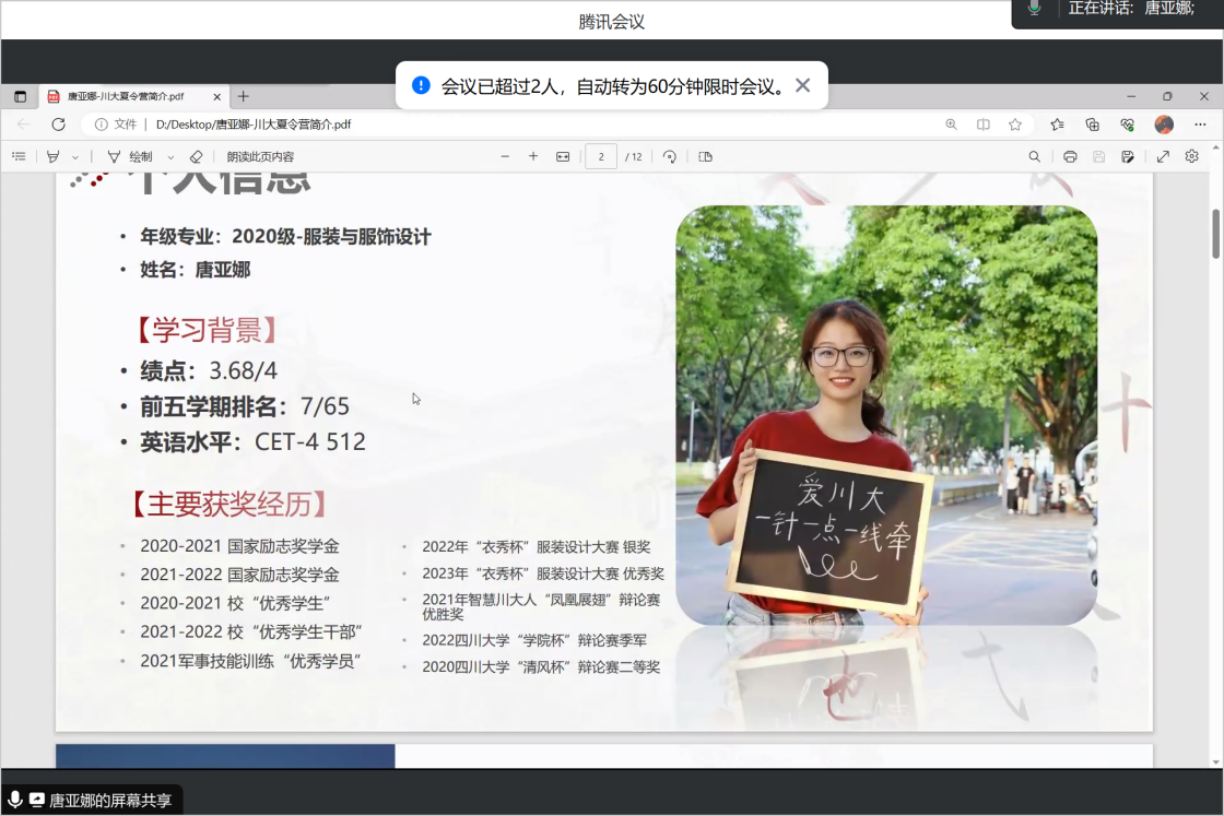会议由服装与服饰设计系副主任申鸿副教授主持,服装与服饰设计系主任杨璐铭教授从专业特色、课程设置、师资力量、科学研究、特色活动等方面向两位同学做了详细介绍。两位同学分别做了自我介绍,包括就读学校、专业、成绩绩点、科研训练、实践活动、感兴趣的研究方向等内容。期间,两位同学与老师就相关问题进行了沟通和答疑。最后,老师们勉励同学持续努力并提出了相关建议。