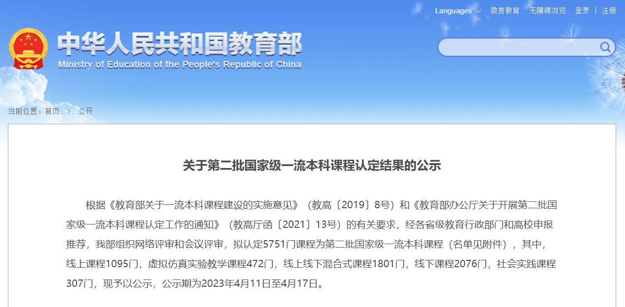 关于第二批国家级一流本科课程认定结果的公示