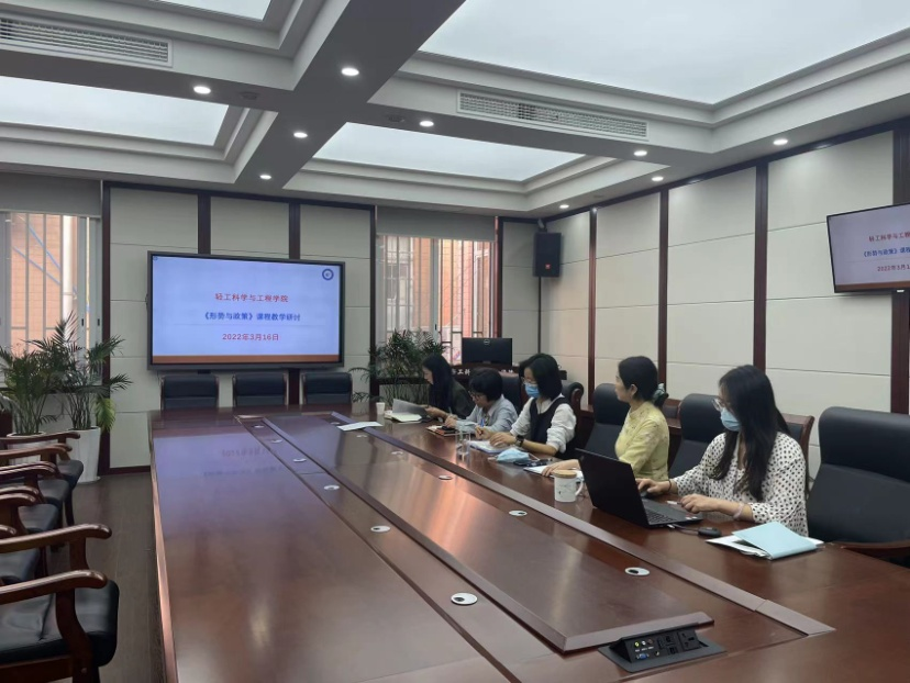 为提高形势与政策课教学针对性与实效性,增强思想政治教育与学生日常管理的有机结合,2022年3月16日上午,轻工科学与工程学院形势与政策教研室在纺工附楼205进行了2022年春季学期形势与政策课的集体备课研讨会。学生事务办公室主任、2019级本科生辅导员贺婷老师,团委书记、研究生辅导员李晓秀老师,2018级本科生辅导员杨维老师,2020级本科生辅导员余昕玲老师,2021级本科生辅导员王舒灏老师一起参加了备课研讨。