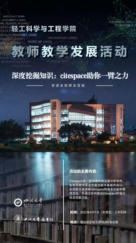 在bw必威西汉姆联官网服装与服饰系近日与校图书馆联合举办的教师教学发展活动中,参会师生收获颇丰,深感信息素养对科研工作的重要性。为进一步满足师生科研工作需求,我系特别邀请了四川大学图书馆王圣洁老师和魏丽敏老师,于2022年4月1日在四川大学望江校区纺工附楼205会议室继续开展了主题为“深度挖掘知识:CiteSpace助你一臂之力”的教师教学发展系列活动。参加本次活动的主要人员有服装与服饰设计系主任杨璐铭教授、副系主任申鸿副教授、轻工生物技术教研室主任金垚副教授、服装与服饰系教师及学生共计四十余人。
