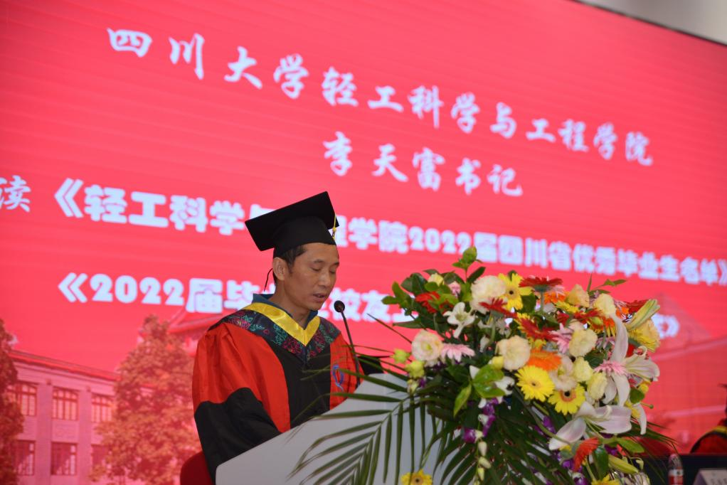 毕业暨授位典礼在庄严的国歌声中正式开始。首先,彭必雨院长代表学院党政致辞。彭院长向2022届圆满完成学业,获得学士、硕士、博士学位的同学们表示最热烈的祝贺!向前来参加毕业典礼的各位领导、导师代表、家长代表表示衷心的感谢!彭院长同与会人员一起回顾了学院近年来在学科建设、人才培养、科学研究等方面取得成绩。彭院长指出,这些成绩的取得离不开学院全体教师的集体智慧与辛勤工作,离不开学院全体同学的积极配合与全面参与,学院学科与专业的良好发展也定将是提升毕业生学历价值与社会认同的重要载体。过去的成绩永远属于我们每一位轻工人,未来的发展仍需全院师生和轻工校友们的鼎力支持。同时,彭院长向毕业生提出三点希望。第一、志存高远、不忘初心,做一个目标明确与意志坚定的人,坚定的朝着自己的生涯目标迈进。第二、脚踏实地、砥砺奋斗,做一个勤奋务实与追求卓越的人,用最美的奋斗去创造属于你的最美人生。第三、增强本领、服务行业,做一个常怀感恩与回报社会的人。希望同学们在奋斗中成就自我、回报社会,真正成为新时代的主人,在新的人生征程中创造出无愧于时代的辉煌业绩。