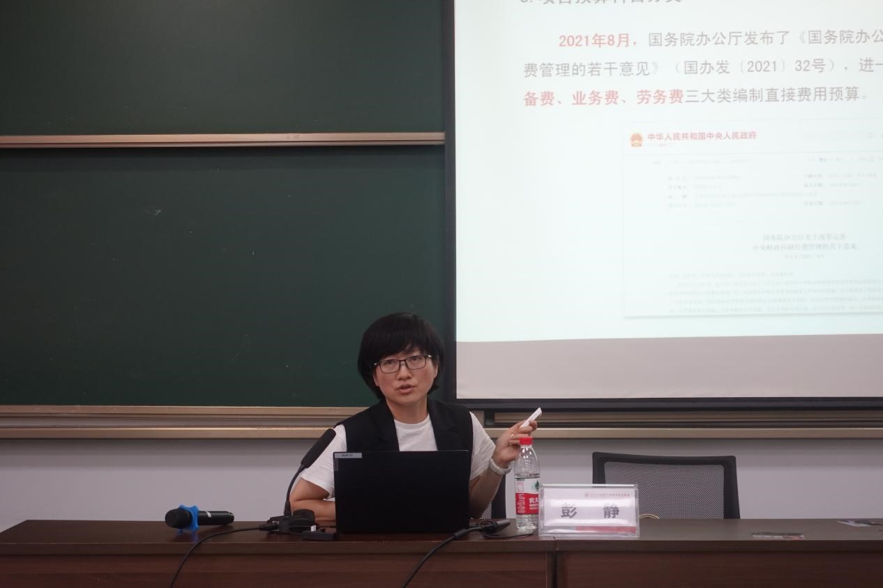 校科研经费管理科科长、高级会计师彭静以《科研经费使用中的财务风险》为题,对科研经费的分类、预算、管理政策等进行了详细讲解,重点介绍了在科研经费的实际使用中的风险点,以违纪失范的典型案例警示学员,加强学员警示教育。