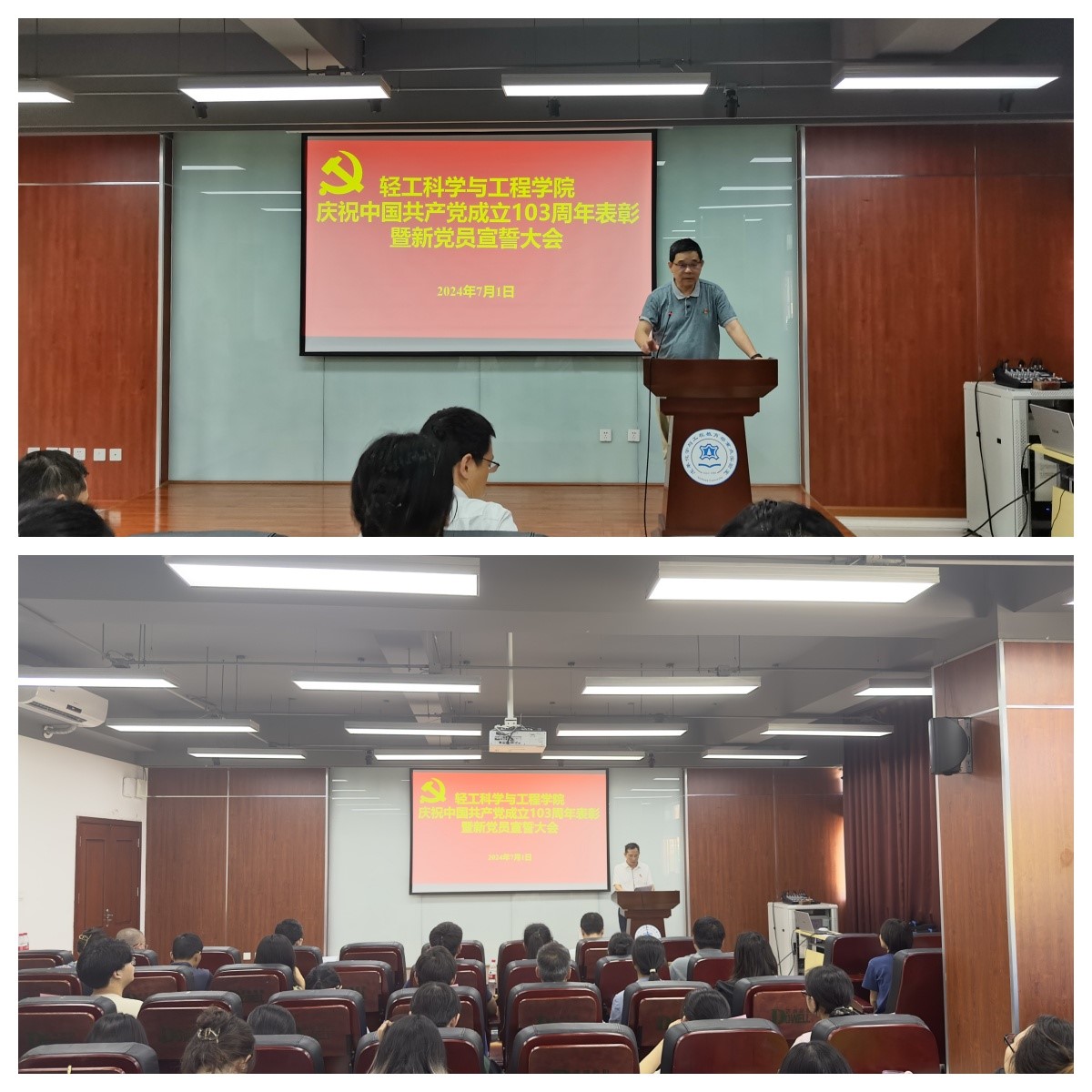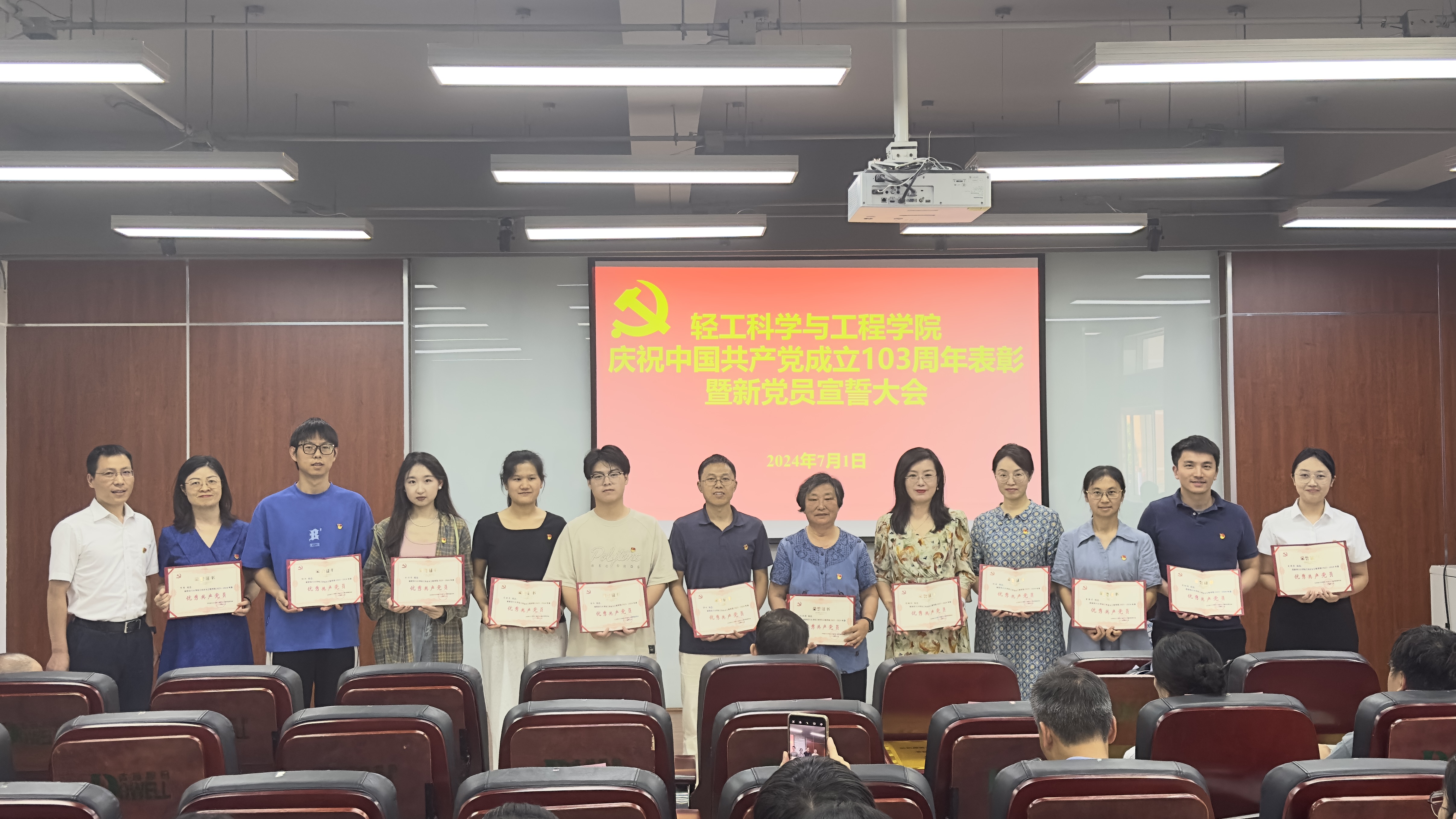 2024年7月1日下午,学院在皮革楼215报告厅隆重举行庆祝建党103周年表彰暨党员宣誓大会。学院班子成员、两委委员、支部代表、获奖支部、个人及新发展党员代表参加本次会议。会议由彭必雨院长主持。