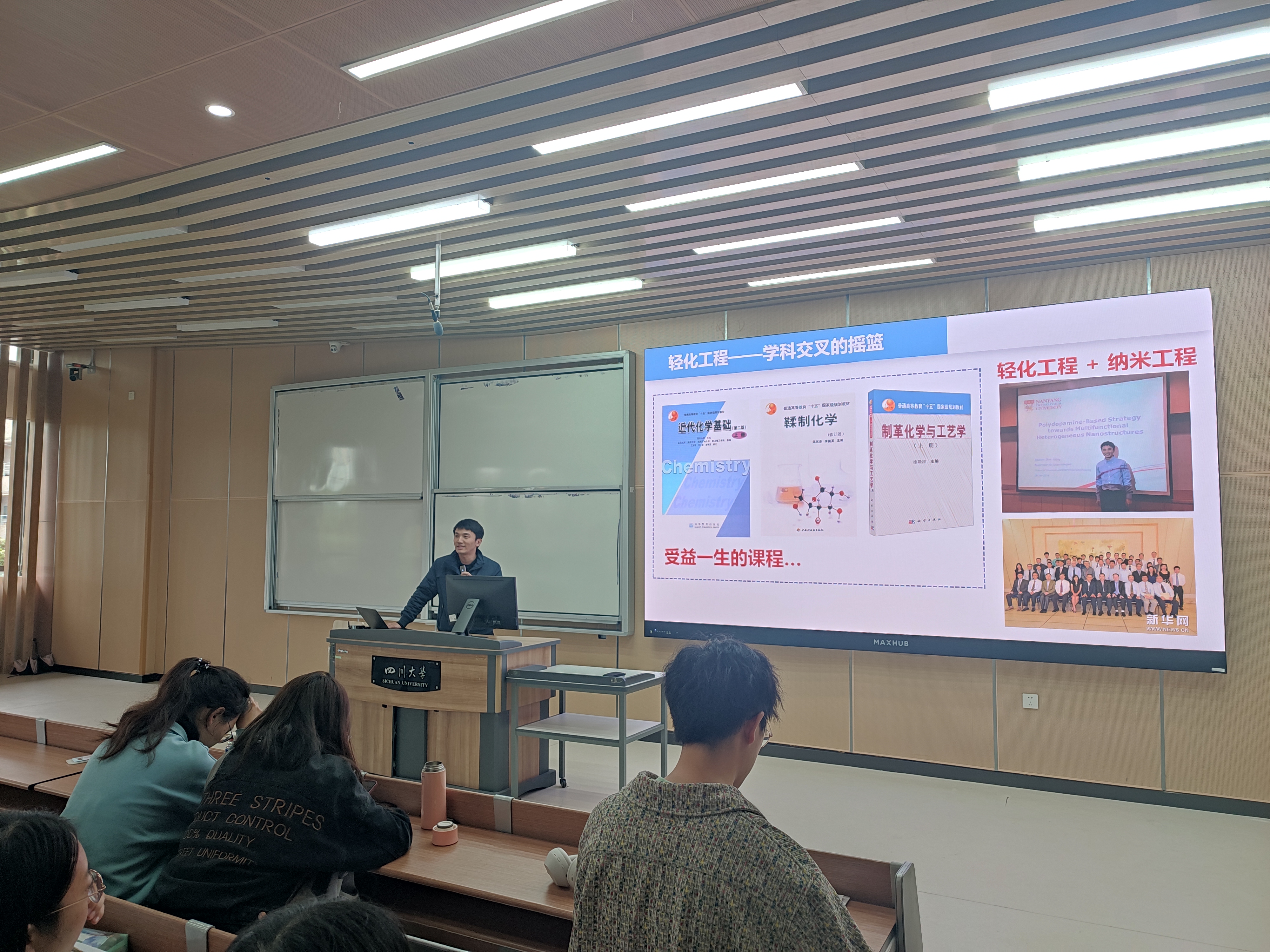 紧接着,周加境特聘研究员结合自身发展经历与专业认知为同学们介绍了轻化工程专业的发展领域和就业方向,并详细展示了该专业的优秀师资队伍及顶级科研硬件设备。