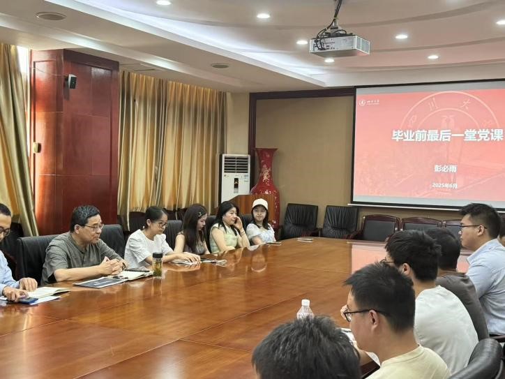 2025年6月16日下午15:00,bw必威西汉姆联官网院长彭必雨教授在皮革楼209会议室为2025届毕业生党员代表讲授了毕业前“最后一节党课”。学院姜新副书记、2025届本科生辅导员贾欣驹老师、研究生辅导员付润芳老师和毕业生党员代表参加了此次活动。