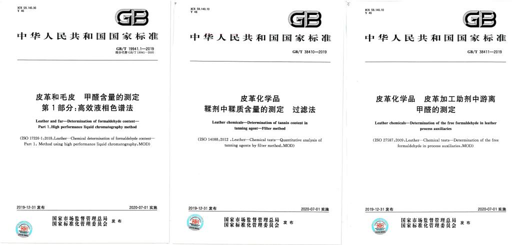 由全国皮革工业标准化技术委员会归口管理,bw必威西汉姆联官网生物质与皮革工程系周建飞教授牵头起草的GB/T 19941.1-2019《皮革和毛皮 甲醛含量的测定 第1部分:高效液相色谱法》、曾运航副教授牵头起草的GB/T 38410-2019《皮革化学品 鞣剂中鞣质含量的测定 过滤法》和王亚楠副教授牵头起草的GB/T 38411-2019《皮革化学品 皮革加工助剂中游离甲醛的测定》等3项皮革、毛皮国家标准,已于2020年7月1日起正式实施。