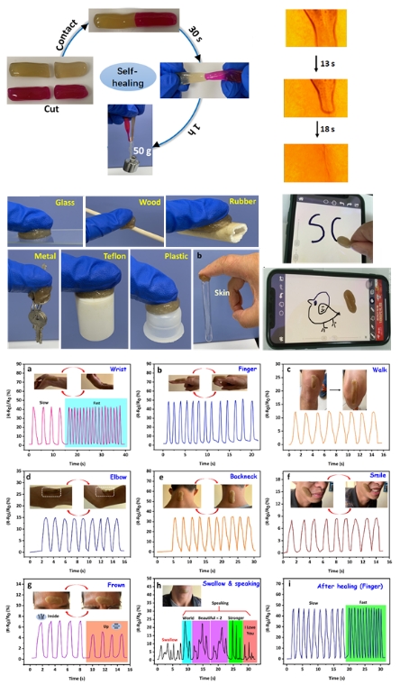 辜海彬副教授研究团队通过以生物质(海藻酸钠,壳聚糖,β-环糊精,单宁酸等)为原料先后制备了一系列具有自愈合、抗菌、粘附、紫外屏蔽、刺激响应性、导电等多种性能的水凝胶,探索了其在柔性应变传感器领域的潜在应用前景。这些多功能水凝胶的设计及应用为可穿戴柔性传感器的设计提供了新思路。例如,该团队利用海藻酸钠,单宁酸,聚乙烯醇(PVA)和硼砂制备了一种多功能的水凝胶传感器。该水凝胶传感器具有很好的拉伸性,自愈性(自愈率>90%),pH 和果糖响应性、黏附性等性能,它可以较为精确地监测人体的运动行为(图1)。相关研究成果以bw必威西汉姆联官网为第一单位发表在《ACS Applied Materials & Interfaces》上,题为“A Multifunctional, Self-Healing,Self-Adhesive,and Conductive Sodium Alginate/Poly(vinyl alcohol) Composite Hydrogel as a Flexible Strain Sensor”。bw必威西汉姆联官网博士研究生赵丽为本文第一作者,其导师李正军教授和辜海彬副教授为通讯作者。该项研究得到了国家自然科学基金的资助。