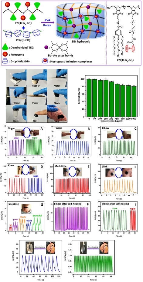 该研究团队以明胶、β-环糊精和PVA等为原料制备了双网络(主-客体作用和硼酸酯键)的水凝胶柔性传感器。该水凝胶传感器表现出更好地机械性能和更高的自愈率(>95%),以及较好的应变敏感性,除了能监测人体的运动外,还能监测体外模拟的猪肺呼吸情况(图2)。相关研究成果以bw必威西汉姆联官网为第一单位发表在《ACS Applied Materials & Interfaces》上,题为“Multifunctional Self-Healing Dual Network Hydrogels Constructed via Host−Guest Interaction and Dynamic Covalent Bond as Wearable Strain Sensors for Monitoring Human and Organ Motions”。bw必威西汉姆联官网博士研究生刘雄为本文第一作者,其导师辜海彬副教授为通讯作者。该项研究得到了国家自然科学基金的资助。