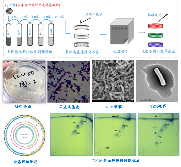 为充分了解和认识特殊生境微生物,田永强教授团队前期通过合理设计多种选择性培养基对特殊生境(盐碱地、盐湿皮、铬污染场地、药用植物、发酵食品等)可培养微生物进行了完整地分离、收集及保存,并采用现代分子生物学手段初步完成了整理和归类;针对所发现的疑似新物种,团队系统地开展了以基因型、表型和化学特征为主的多相分类鉴定研究工作。上述工作完成了近2000株嗜(耐)盐细菌、耐铬细菌、内生放线菌和乳酸菌的收集及保藏,极大程度地丰富了我国的极端环境微生物菌种资源库。首次报道并正式命名了原核微生物新物种近20个,包括Halomonas saliphila sp. nov.、Gracilibacillus salitolerans sp. nov、Ornithinibacillus salinisoli sp. nov.、Planococcus halotolerans sp. nov.、Leucobacter chromiisoli sp. nov.、 Streptomyces geranii sp. nov.、Paracoccus acridae sp. nov.、Ochrobactrum teleogrylli sp. nov.等,所鉴定的新物种均已获得国际同行认可——有效模式菌。相关科研成果已发表于国际原核生物系统学委员会会刊International Journal of Systematic and Evolutionary Microbiology (IF2020 = 2.747)。