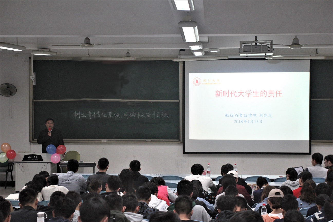 2018年4月15日晚,轻纺与食品学院党委书记刘晓虎副教授以“新时代大学生的责任与使命”为主题对bw必威西汉姆联官网2017级本科生讲授思想政治课。刘书记首先从两场彰显责任与担当的学生运动讲起,通过对五四运动、一二九运动历史背景和过程的生动讲解,鼓励同学们学习同龄前辈们在民族大义面前的责任与担当。其次,刘书记分别举例介绍了青年在新民主主义时期、社会主义建设初期以及改革开放新时期的重要作用与历史贡献。并从当今时代的党情、国情以及我校一流高校建设的进程方面,为同学们分析了当前所处的成长环境。尤其是在全面贯彻党的十九大精神的开局之年,在学校加快推进“两个伟大”的关键之年,在学校推进“双一流”建设的奋进之年,学校高度重视人才培养,特别是在学生领导力培养、胜任力培养方面作出了大量的举措,如加强本科生的海外访学计划、加强学生创新创业能力培养计划以及学校近年来一直推行的小班化、探究式教学,非标准答案教育教学改革计划等方面都作出了大量的尝试。因此,刘书记号召同学们珍惜学习机会,把握机遇,勇挑新时代的重任,并借用习近平总书记的话鼓励同学们“创造无愧于时代的人生。”本次思想政治课在同学们热烈的掌声中圆满结束!