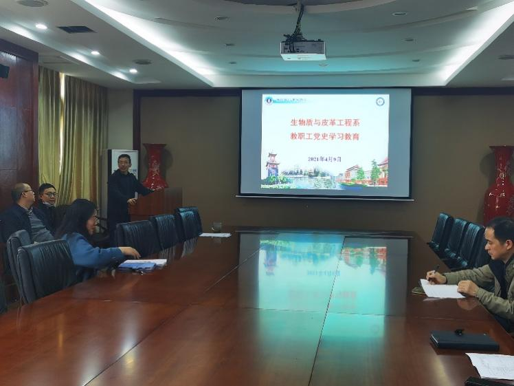 2021年4月9日下午,生物质与皮革工程系全体教职工在皮革楼209会议室开展了党史学习教育专题活动