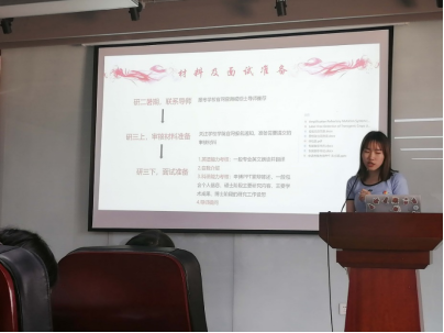 首先,读博深造的张婷和朱小颖同学分享了关于升学的经验。张婷同学从升学前期准备和资料提交两个方面介绍了整个流程,其中包括科研能力和英语水平的考核。朱小颖同学强调了与导师交谈的重要性,研究生阶段成果为录取与否的主要条件。