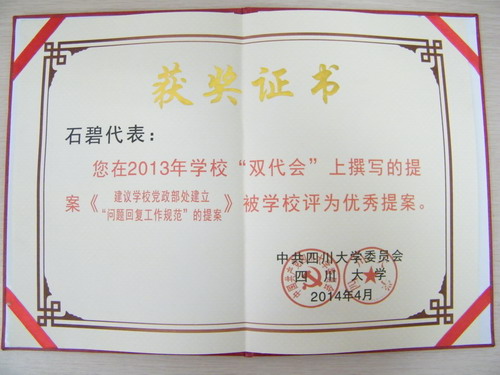 经学校双代会提案工作小组评选,其中2项获得优秀提案,并在第三届教代会暨第二届工代会第四次会议上给予表彰。