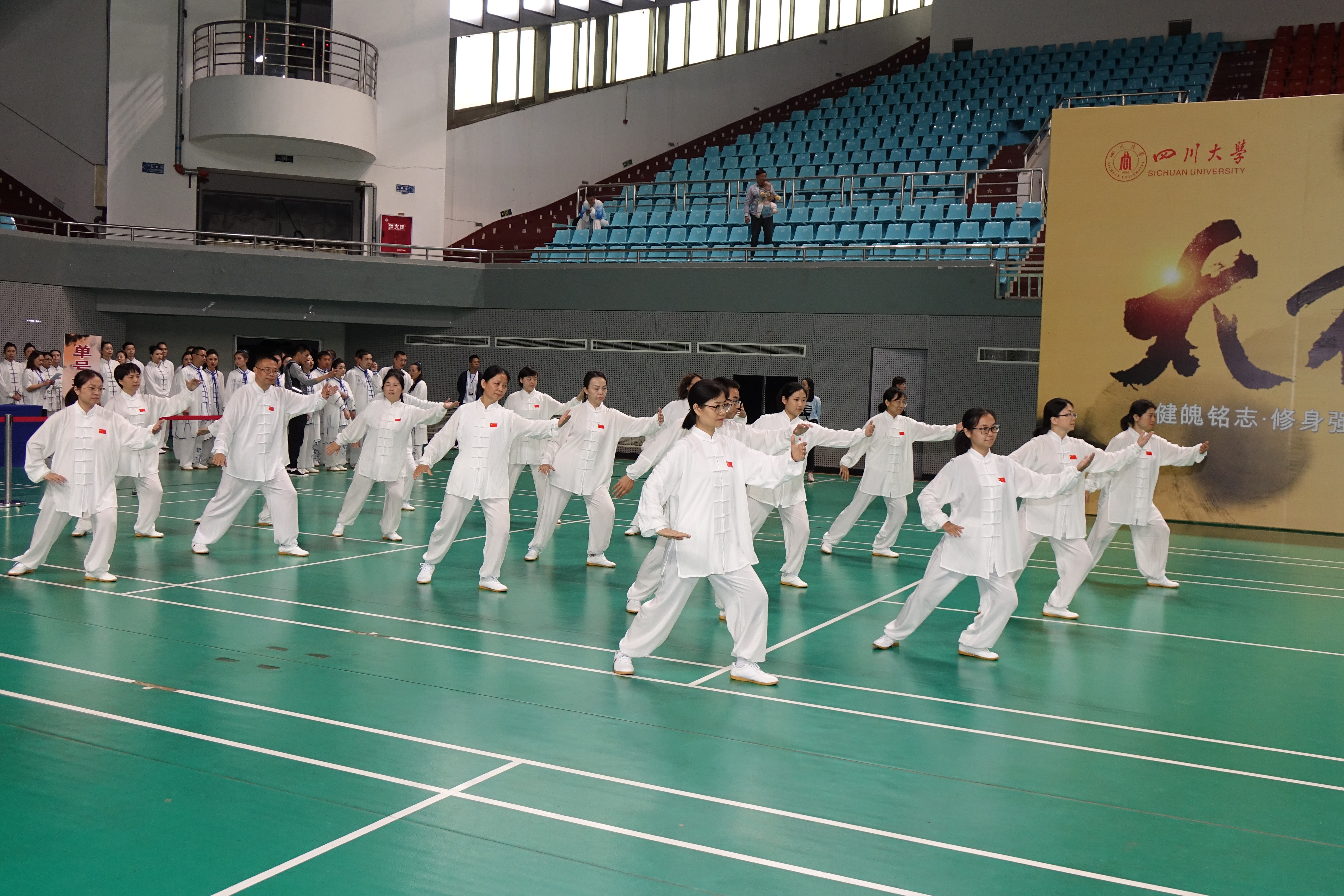 为庆祝新中国70周年华诞,弘扬中华传统文化,传承太极文化精髓,促进校园全民健身运动积极开展,倡导广大教职工走出办公室、走上运动场,强身健魄,身体力行,丰富校园文化生活,展示我校教职工健康向上的良好精神风貌,四川大学于2019年10月18日举办“健魄铭志·修身强国”——四川大学庆祝新中国成立 70 周年教职工太极拳比赛。