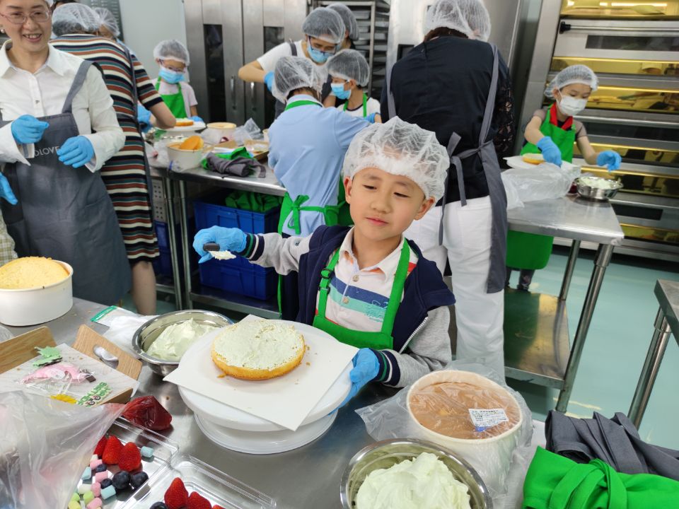 制作现场热闹非凡,弥漫着浓浓的甜蜜和快乐。在面点老师的指导和示范下,孩子们和家长一起大展身手,发挥想象在蛋糕胚上绘出美丽的奶油图案,用水果来点缀蛋糕出缤纷多彩的造型,享受节日温馨愉悦的亲子时光。